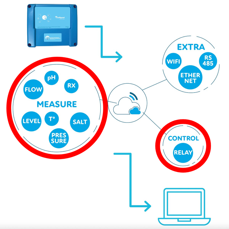 Wifipool CONNECT-PRO meet- en controledoos uitbreidbaar met pH, RX, 3 x temperatuur-, flow-, 3 x niveau-, druk- en conductiviteitsmeting, ethernetaansluiting en 4 stekkers